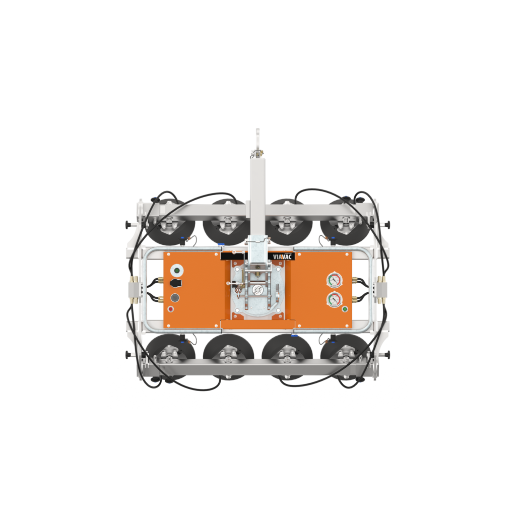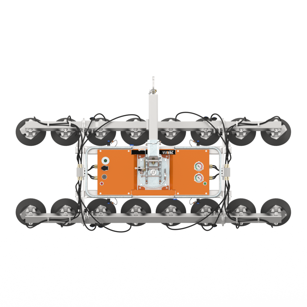 The VIAVAC GBXL Curved can be installed quickly and easily in two different configurations. In its smallest configuration, this glass lifter hoists curved glass up to 350 kilograms. Need more capacity? Expanding the glass lifter with additional suction pads increases the lifting capacity to 700 kilograms. The handling dimensions of the glass lifter can be adjusted from a minimum of 960 × 1,100 mm (350 kg) to a maximum of 960 × 2,200 mm (700 kg).