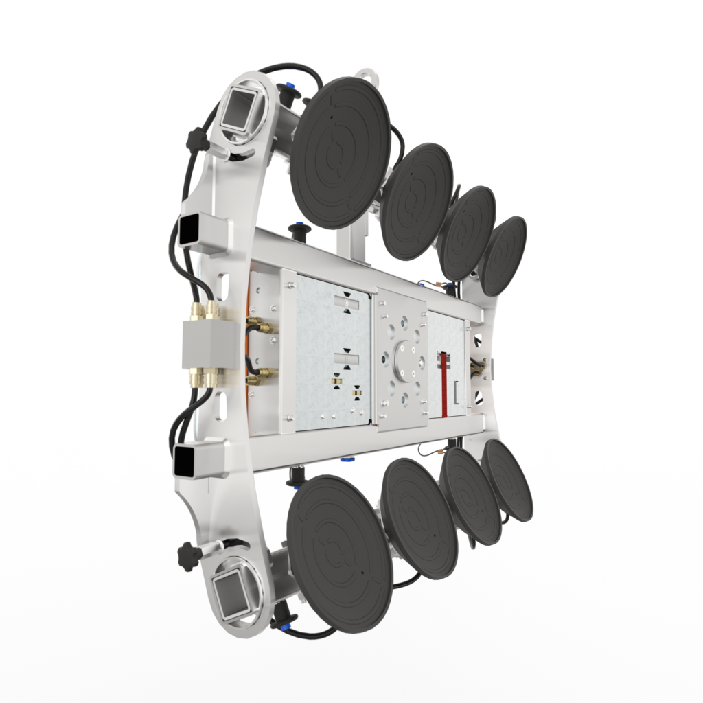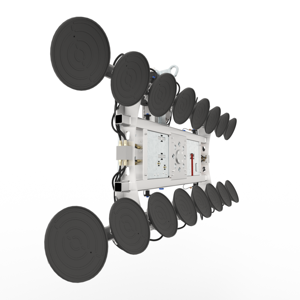 This glass lifter for curved glass is suitable for radiuses from 800 mm. In addition, the glass can be picked up on either the convex or concave side. This allows the glass to be placed on the inside as well as the outside.