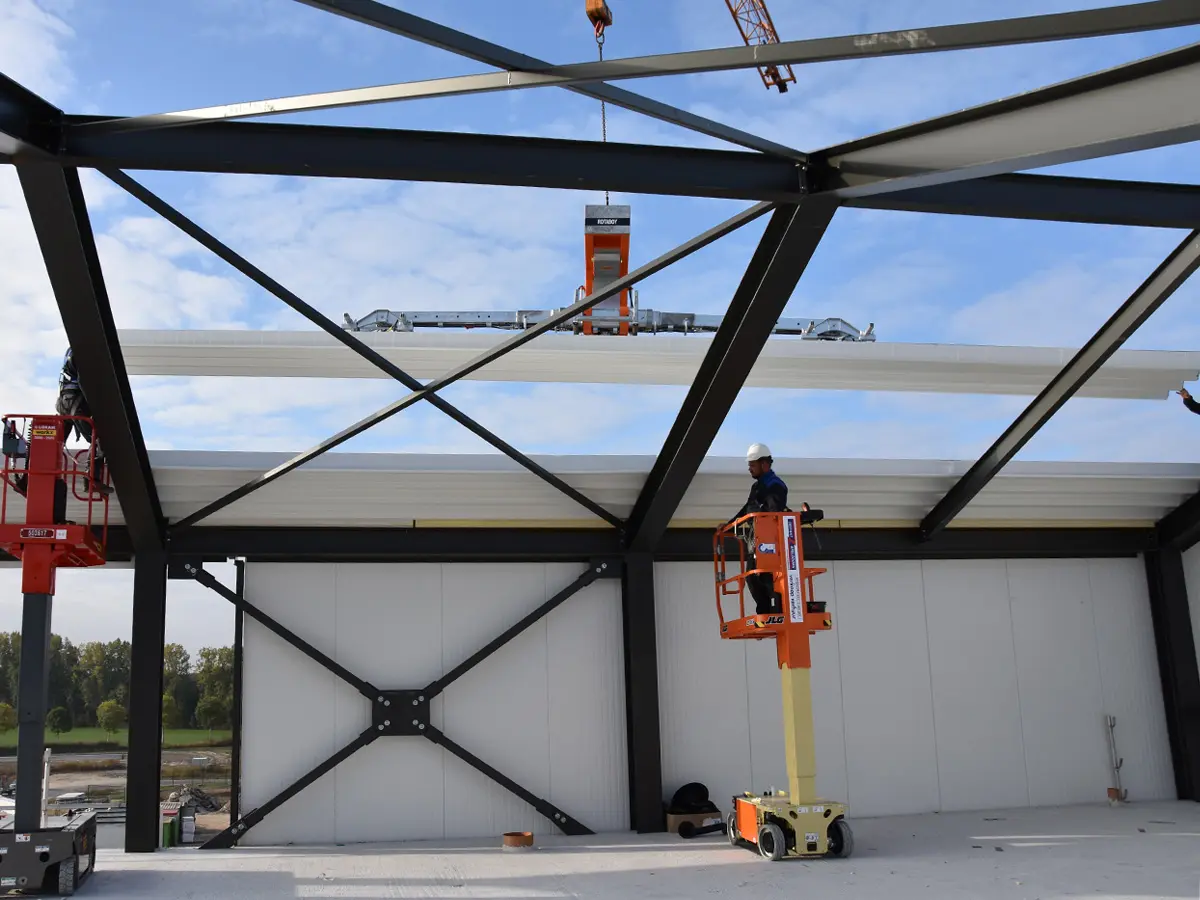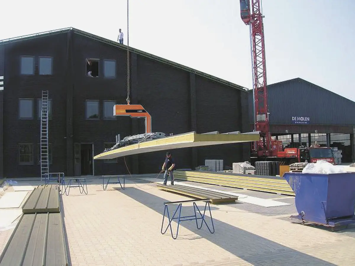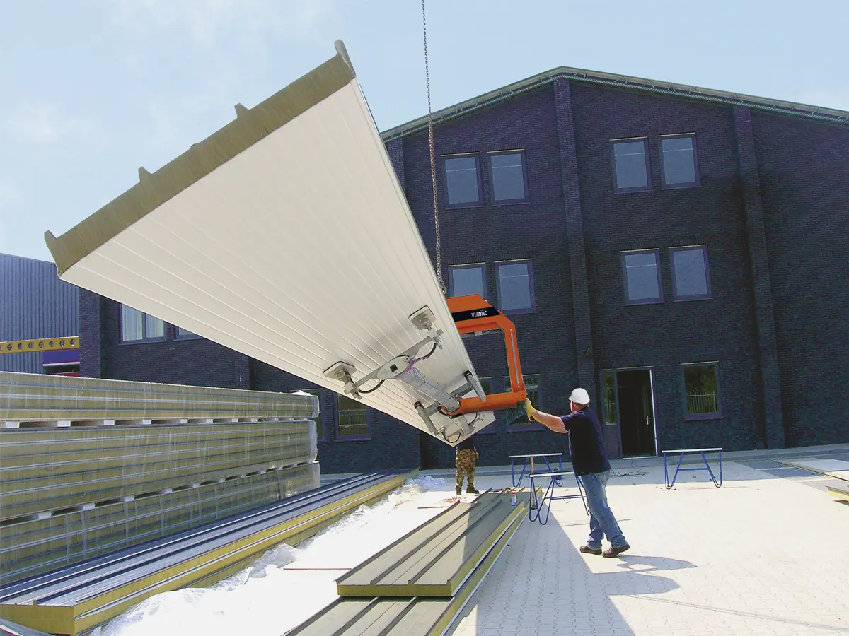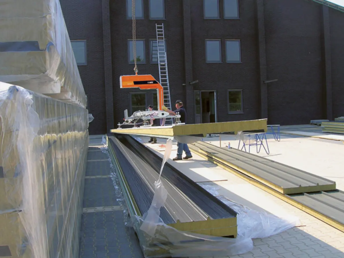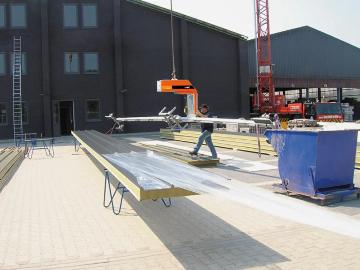 This vacuum lifter has a modular design and can be quickly and easily adapted to different types of installation methods. With the RotaBoy, sandwich roof panels with a maximum length of 18.5 meters and a maximum weight of 350 kg are effortlessly rotated 180° and lifted to the roof at the touch of a button. Then, you can install them immediately without damage. A second vacuum panel lifter is not required, making the installation process even faster. Within four hours, an entire roof was sealed with a total area of 450 m².